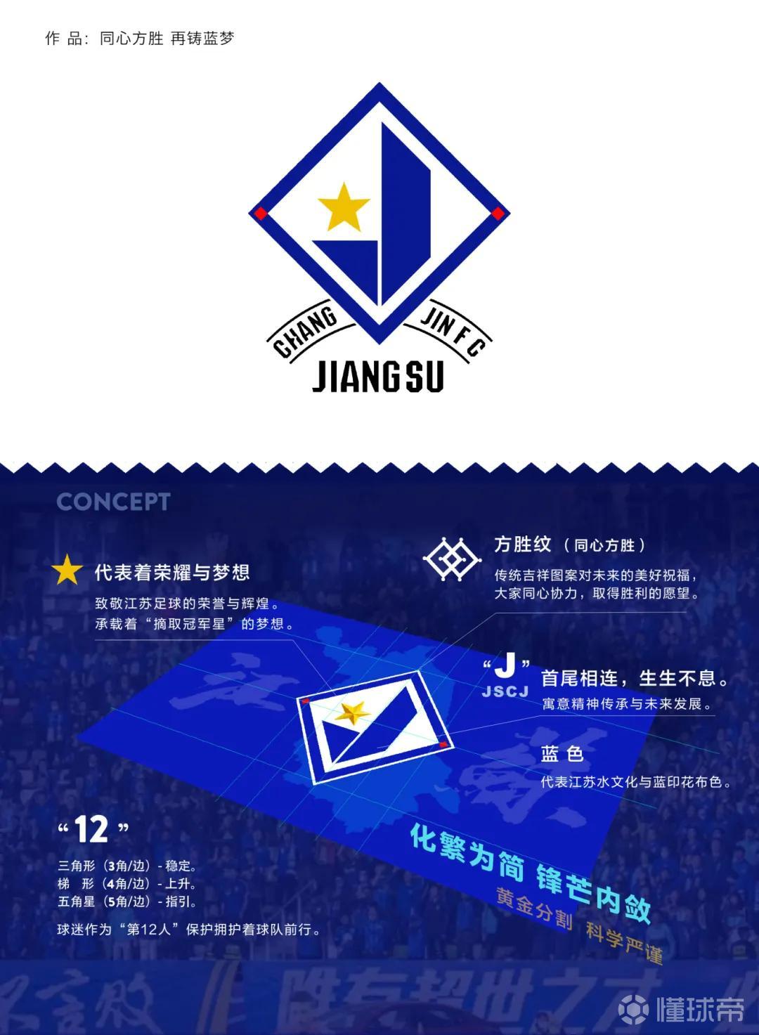 核心元素:“J“是“江与晋”的首字母,首尾相应,寓意着江苏足球辉煌与传承,发展生生不息。中间的三角形,梯形,五角星组成了“12角”,代表球迷作为“第12人”为球队保驾护航。五角星承载着俱乐部“摘取冠军之星”的梦想,又是一颗启明星指引着球队前行的方向。